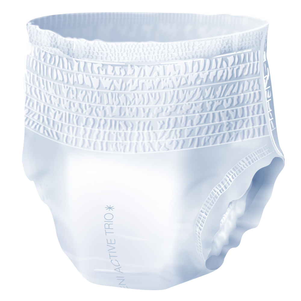 Seni Active Trio - LES sous-vêtements absorbants respirants et jetables pour les personnes actives qui privilégient la discrétion et le confort. Elastiques, ces pants se portent comme des sous-vêtements classiques. Dotés de barrières anti-fuites latérales et du système Extra Dry System (EDS), ils offrent une protection efficace en cas d'incontinence urinaire très forte. Egalement recommandés pour les personnes atteintes de la maladie d'Alzheimer ou d'autres formes de démence qui refusent le port de changes classiques.